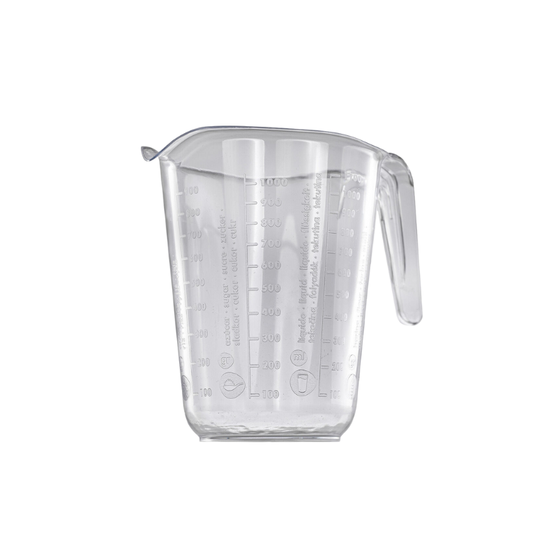 Durable 1 L measuring jug made from high-quality plastic. Transparent design allows for easy monitoring of liquid levels, while clear measurement markings ensure accurate dosing. Perfect for hospitality, home use, catering, and professional kitchens.