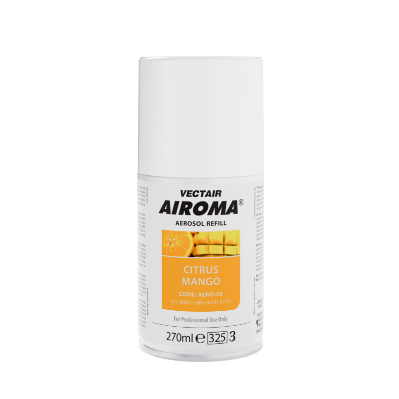 Airoma® Citrus Mango 270 ml profesionalni je refill za automatske dozatore mirisa koji donosi intenzivan, svjež i egzotičan voćni miris. Kombinacija sočnih citrusa i slatkog manga stvara ugodnu, toplu atmosferu te učinkovito neutralizira neugodne mirise u prostoru.
